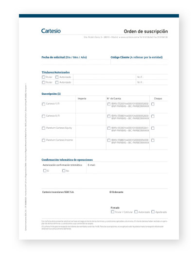 A la cuenta del fondo (se indica la cuenta de cada fondo) y remitir por correo electrónico clientes@cartesio.com o fax una orden de suscripción (PDF Adjunto) firmada. Es imprescindible confirmar la operación enviada por fax, por vía telefónica.
